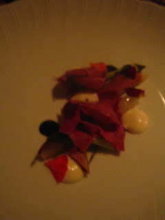 "Beets and Leeks": Maine lobster tail "Pochee au Beurre Deux" with King Richard Leeks, "Pommes Maxim's" and Red Beet Essence. Perectly cooked lobster, silky not rubbery.