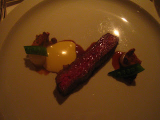 Snake River Farms "Calotte de Boeuf Grillee": Chanterelle Mushrooms, Purple-Top Turnips, Sugar Snap Peas, and "Sauce Bearnaise". Perfectly cooked beef (rare, is there any other way?) and very moist/tender.