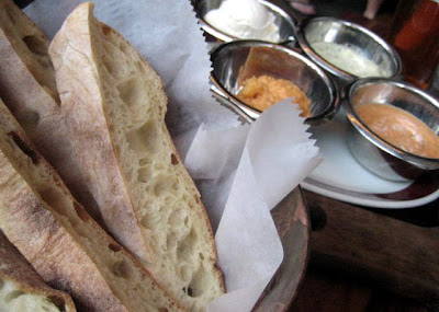 Shmears, Dips, and Housemade Bread ($5): romesco dip, Green goddess dip (avocado based), pimento cheese dip, and airy butter.