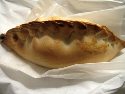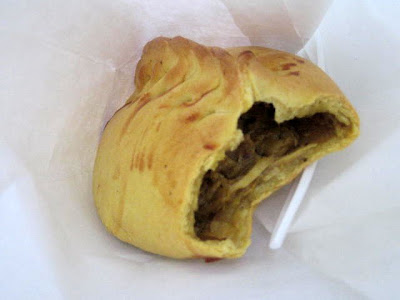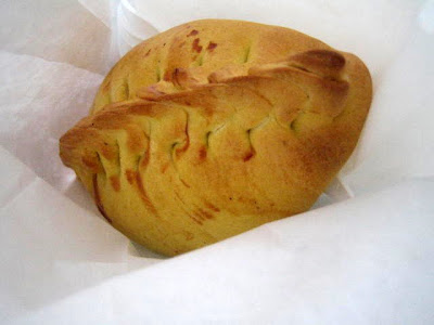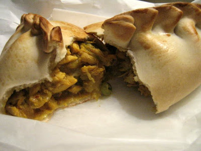 Saltenas ($3.41 or $3.75 after tax): Chicken, potato, green peas, hard boiled egg, raisin, green olives, and onions.