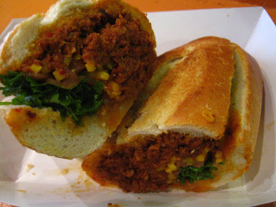We opt for the Sloppy Bao ($7) sandwich. The tasty baguette is filled with flavorful, slightly spicy beef. The beef is well seasoned with shallots, garlic, lemongrass, red curry paste, basil, and fish sauce. Sliced jalapeno peppers add a bit more heat. The spice is offset by the sweet julienne mango, tart pickled onion, fresh cilantro leaves.