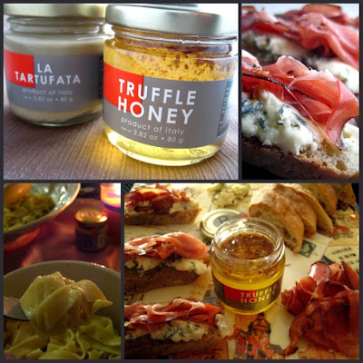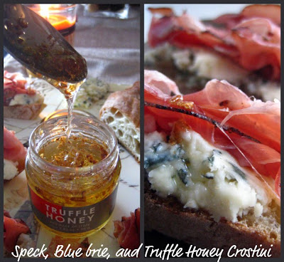 We received the Truffle Honey ($19) - once we opened it, we were hit with a rich, truffle fragrance. We decided to pair it with a salty meat and earthy cheese. We sliced a baguette, grilled it with olive oil, and topped it with blue brie cheese, a thin slice of speck (prosciutto), and drizzled the Truffle Honey on top.