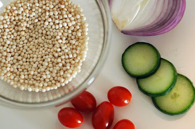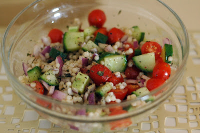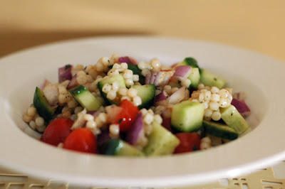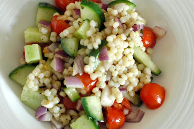 This easy salad makes for a vibrant alternative to rice or pasta. It would make a good side dish for a meat entree. We like the tapioca-like texture of the couscous and could imagine using it in a sweet dish (perhaps with fruit, honey, and cinnamon).
