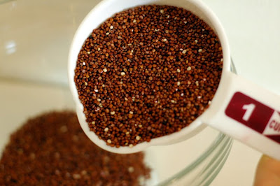 1. Thoroughly rinse the red quinoa. This was the most difficult step as the quinoa is very small. Use a cheesecloth or a paper towel-lined sieve to more easily rinse and drain the quinoa. It's important to rinse these seeds to remove is bitter coating.