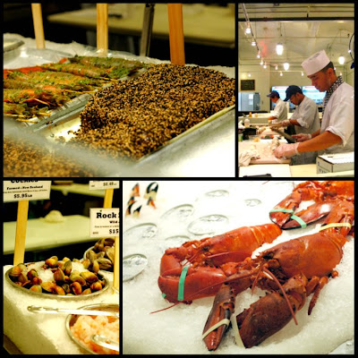 The Lobster Place features tons of fresh seafood, prepared seafood, and prepared foods including sushi rolls, lobster rolls, and various soups and chowders.