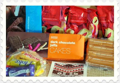 She did not disappoint! She sent me plenty of goodies from department store Marks and Spencer. Tons of sweets including dark chocolate jaffa (sponge cakes topped with real orange filling and half coated in dark chocolate), addictive chocolate caramel wafer sticks, assorted chocolate cookies and tea cakes, and three bags of my precious potato rings (which happily do not contain artificial ingredients).