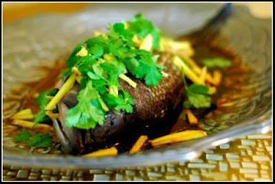 Whole fish is always served for New Year's because it symbolizes prosperity. It is cooked and served with head and tail intact because it represents completeness (plus we both find fish tastier when cooked whole). I cooked the striped bass (covered with the above fish sauce and stuffed with ginger and scallions) in the oven and served it with more ginger and cilantro leaves on top.