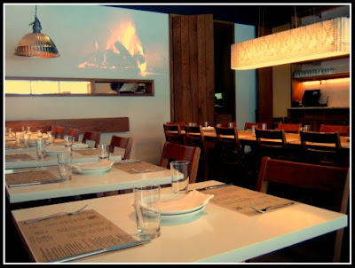 I walked a couple of slushy blocks and arrived at the warm restaurant. It felt like a modern ski lodge inside with the "fireplace" and two long communal tables.