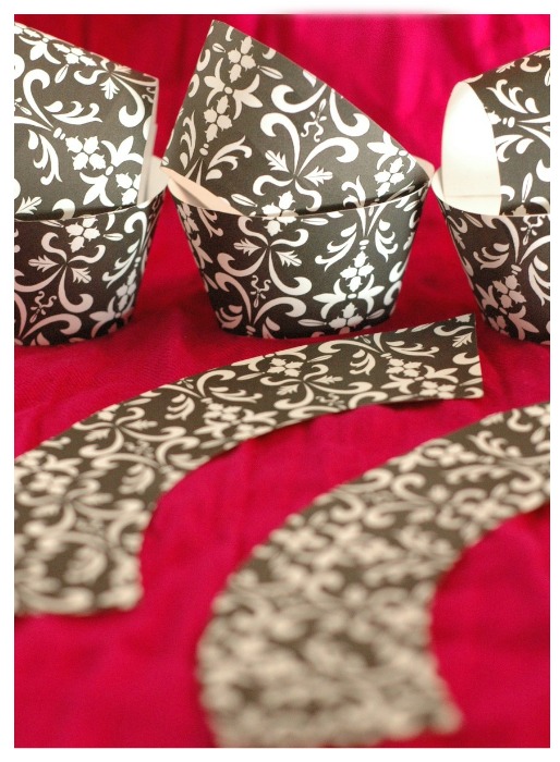 Cupcake wrappers can cost around $1 each, but they're so easy to make. You can use our template (see below) that already has the damask print on it, make copies on card stock, cut out the shapes, and glue/tape the ends together (about 1/4 inch in). You can also use our template for its shape and trace it out on any scrapbooking paper/decorative card stock paper you have.
