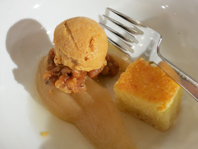 To serve - Slice a poached pear in half, remove the core and stem. Slice into thin slices but maintaining its shape. Arrange neatly in a bowl. Place a rectangle of almond sponge beside it. Scoop some salted caramel ice cream and place on the sponge. Sprinkle the walnut nougatine on the ice cream and the pears. Add some poaching liquid to the bowl and serve.